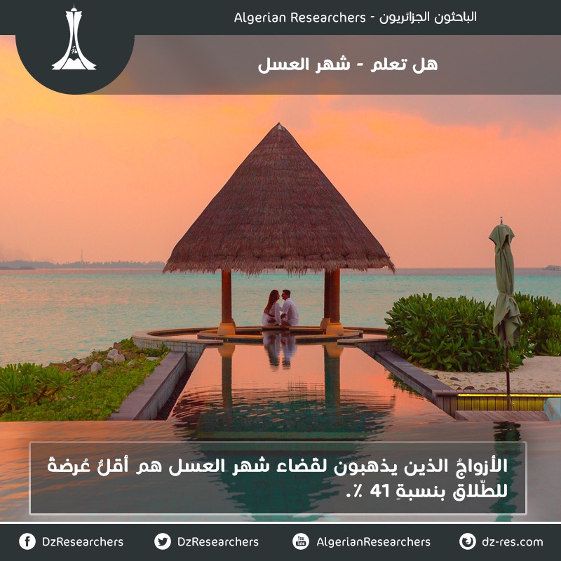 الأزواجُ الذين يذهبون لقَضاء شهر العسل هم أقلُّ عُرضةً للطّّلاق بنسبةِ 41 ٪.
