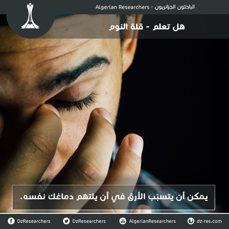 <img class="alignnone wp-image-96565" src="https://www.dz-res.com/wp-content/uploads/2018/07/Insomnia-300x300.jpg" alt="" width="956" height="956" /> يمكن أن يتسبّب الأرق في أن يلتهم دماغك نفسه. <strong>تدقيق لغوي: جيلالي زروخي</strong> <strong>تعديل الصورة: رامي نزلي</strong> <strong>المصادر: <a href="http://www.jneurosci.org/content/37/21/5263">هنا</a> <a href="https://www.newscientist.com/article/2132258-the-brain-starts-to-eat-itself-after-chronic-sleep-deprivation/">هنا</a> <a href="https://www.telegraph.co.uk/science/2017/05/26/sleep-deprivation-can-cause-brain-start-eating/">هنا</a></strong>