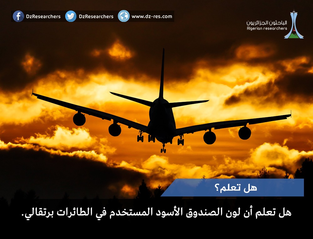 <img class="alignnone wp-image-14792 size-full" src="https://www.dz-res.com/wp-content/uploads/2017/11/blackbox.jpg" alt="" width="1000" height="764" /> هل تعلم أن لون الصندوق الأسود المستخدم في الطائرات برتقالي. <strong>المصدر: <a href="https://www.nytimes.com/2014/04/06/magazine/who-made-that-black-box.html">هنا</a></strong> <strong>تصميم: رامي نزلي</strong>