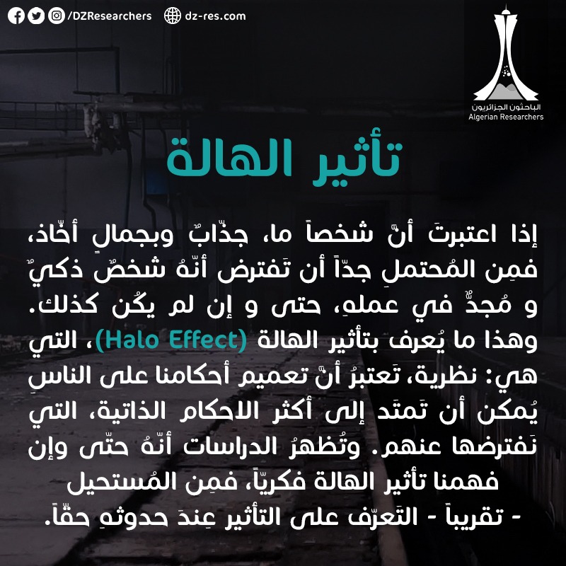 إذا اعتبرتَ أنَّ شخصاً ما، جذّابٌ وبجمالٍ أخّاذ، فمِن المُحتملِ جدّاً أن تَفترض أنّهُ شخصٌ ذكيٌ و مُجدٌّ في عملهِ، حتى و إن لم يكُن كذلك. وهذا ما يُعرف بتأثير الهَالة (Halo Effect)، التي هي: نظرية، تَعتبرُ أنَّ تعميم أحكامنا على الناسِ يُمكن أن تَمتَد إلى أكثر الاحكام الذاتية، التي نَفترضها عنهم. وتُظهرُ الدراسات أنّهُ حتّى وإن فهمنا تأثير الهَالة فكريّاً، فمِن المُستحيل – تقريباً – التَعرّف على التأثير عِندَ حدوثهِ حقّاً.