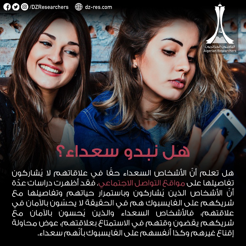 هل تعلم أنّ الأشخاص السعداء حقًا في علاقاتهم لا يُشاركون تفاصيلها على مواقع التواصل الاجتماعي. فقد أظهرت دراسات عدّة أنّ الأشخاص الذين يُشاركون وباستمرار حياتهم وتفاصيلها مع شريكهم على الفايسبوك هم في الحقيقة لا يحسّون بالآمان في علاقتهم، فالأشخاص السعداء والذين يُحسون بالآمان مع شريكهم يقضون وقتهم في الاستمتاع بعلاقتهم، عوض محاولة إقناع غيرهم وكذا أنفسهم على الفايسبوك بأنّهم سعداء.