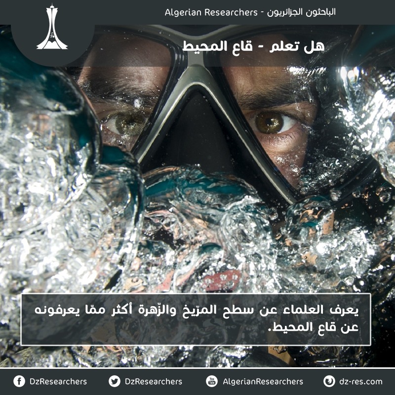 <img class="alignnone wp-image-19767" src="https://www.dz-res.com/wp-content/uploads/2018/04/ocean-300x300.jpg" alt="" width="959" height="959" /> <p style="text-align: justify">يعرف العلماء عن سطح المرّيخ والزّهرة أكثر ممّا يعرفونه عن قاع المحيط.</p> <strong>تدقيق لغوي: جيلالي زرّوخي</strong> <strong>تعديل الصورة: رامي نزلي</strong> <strong>المصادر: <a href="https://www.nasa.gov/audience/forstudents/5-8/features/oceans-the-great-unknown-58.html">هنا</a> <a href="https://www.scientificamerican.com/article/just-how-little-do-we-know-about-the-ocean-floor/">هنا</a></strong>