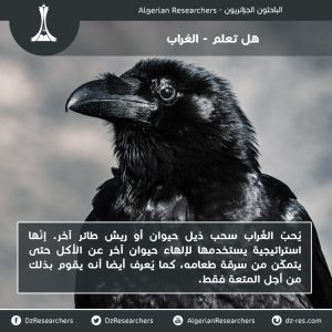 <img class="alignnone wp-image-19771" src="https://www.dz-res.com/wp-content/uploads/2018/04/crow-300x300.jpg" alt="" width="956" height="956" /> <p style="text-align: justify">يُحبّ الغُراب سحب ذيل حيوان أو ريش طائر آخر. إنّها استراتيجية يستخدمها لإلهاء حيوان آخر عن الأكل حتى يتمكّن من سرقة طعامه، كما يُعرف أيضا أنه يقوم بذلك من أجل المتعة فقط.</p> <strong>تدقيق لغوي: جيلالي زروخي</strong> <strong>تعديل الصورة: رامي نزلي</strong> <strong>المصدر: <a href="http://dnr.wi.gov/wnrmag/html/stories/2007/oct07/crows.htm">هنا</a></strong>